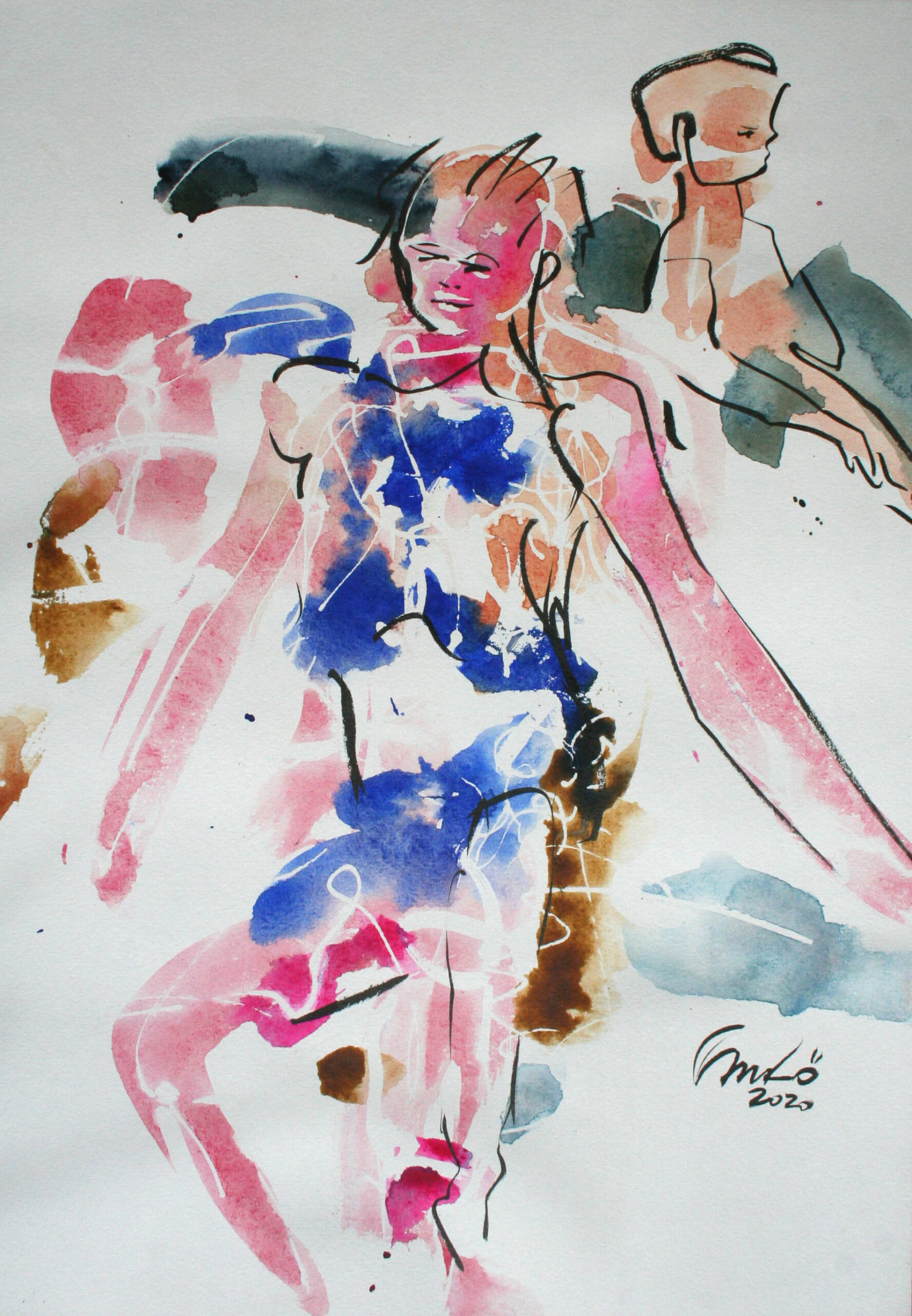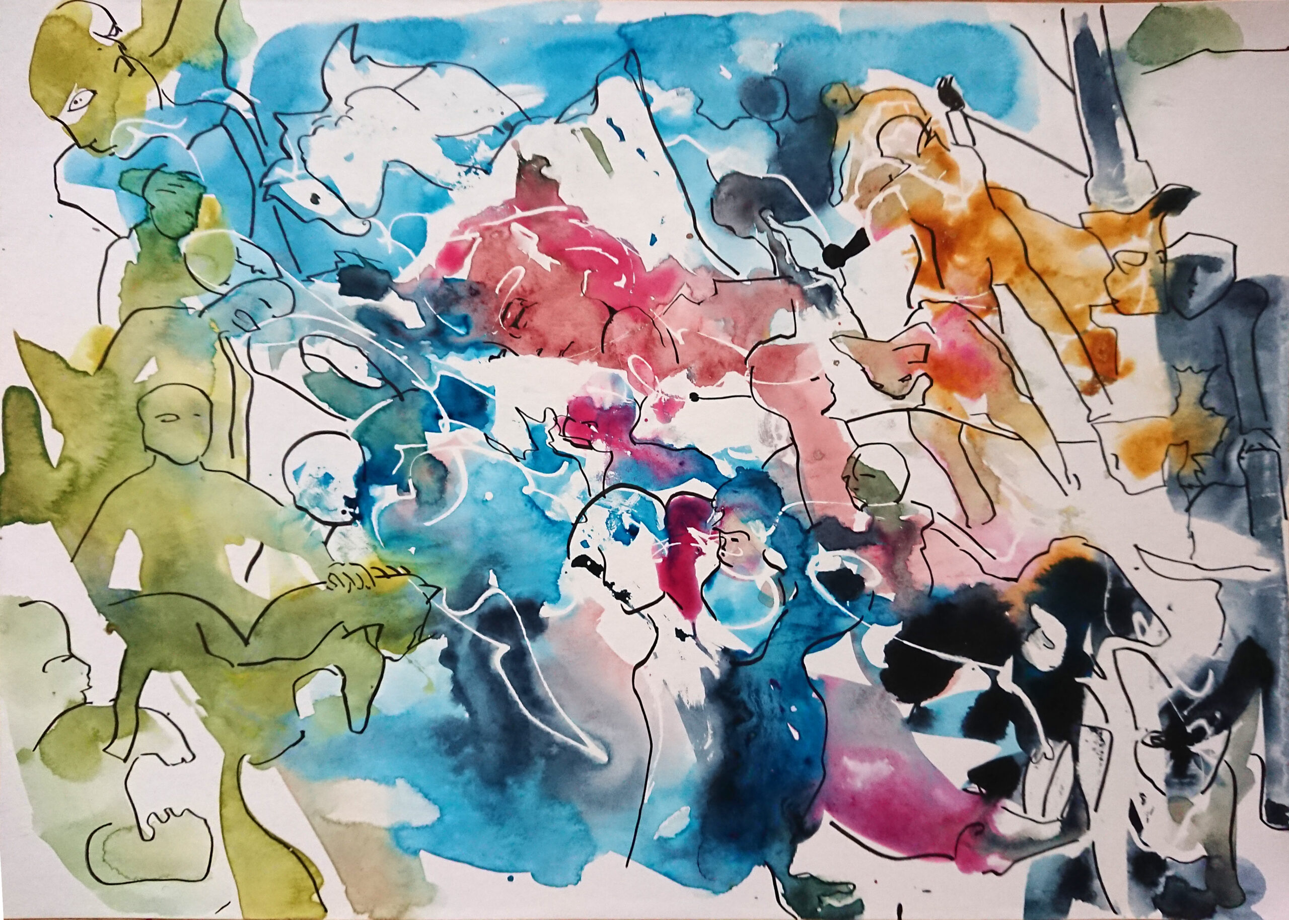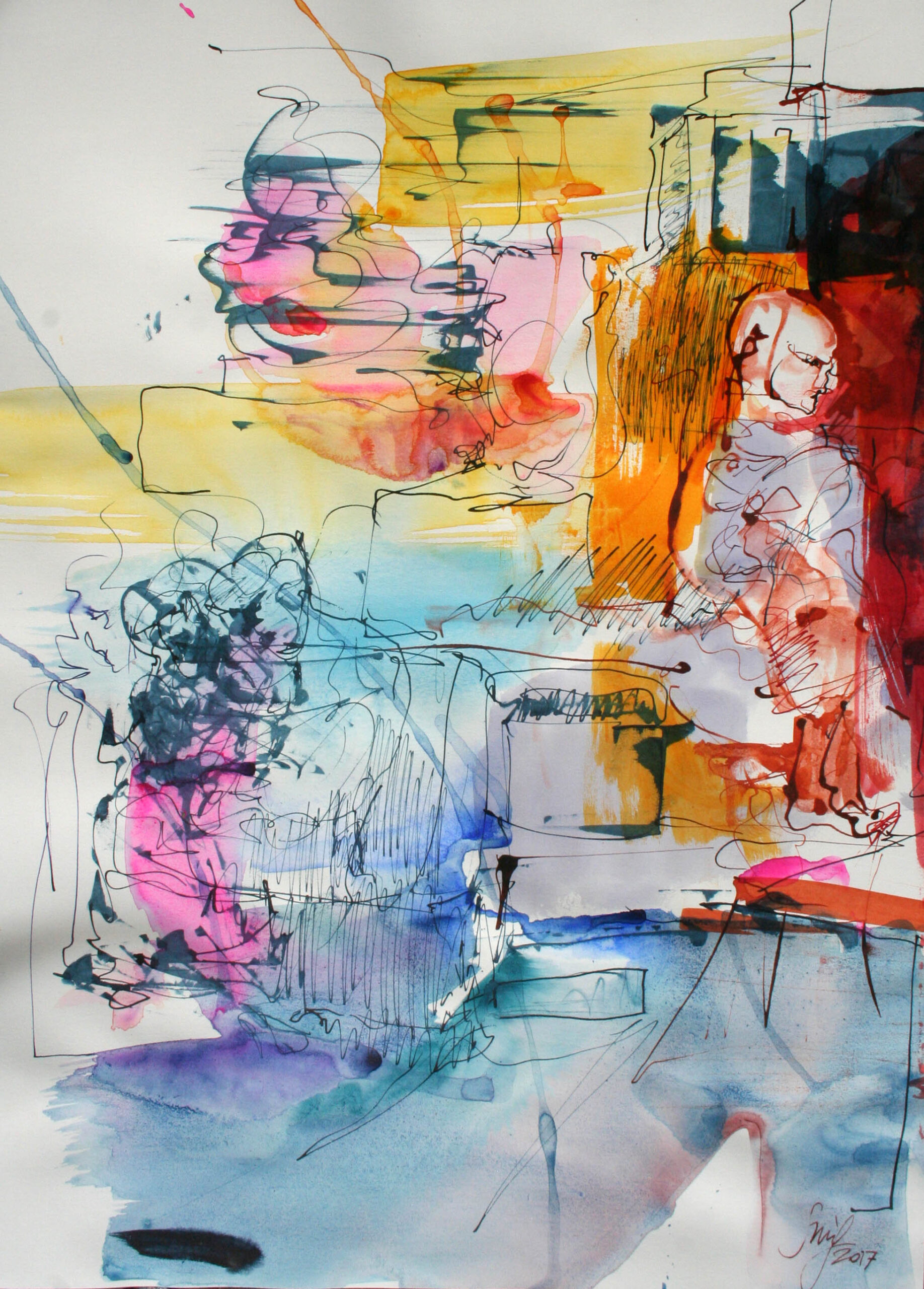 Das Leichte und Transparente der Aquarellmalerei kombiniert mit dem harten Kontrast der schwarzen Tusche hat für mich einen besonderen Reiz und sind meine bevorzugten Materialien auf Papier. Als weiteres Werkzeug in meinem Schaffensprozess habe ich den transparenten Maskierfilm für meine Techniken entdeckt. Als Abdeckmaterial für helle Passagen in der Aquarellmalerei konzipiert, verwende ich ihn als weiteren Überraschungsmoment indem ich auf weißem Papier transparente Linien ziehe und erst nach Auftrag der Aquarellfarbe das Ergebnis sehe.