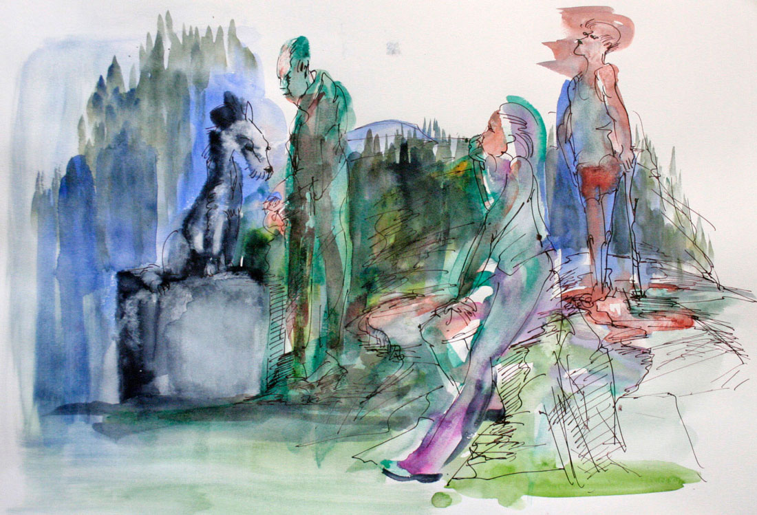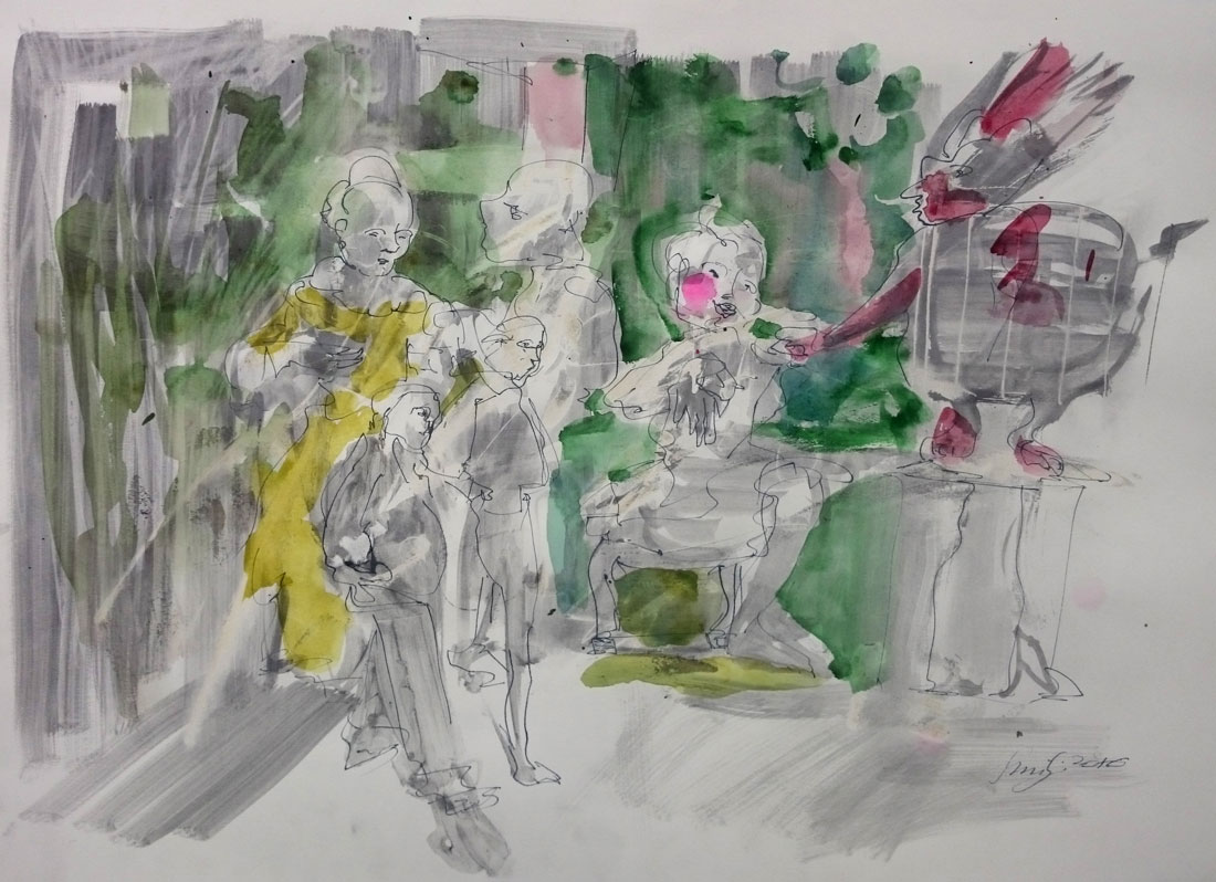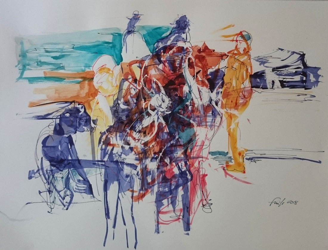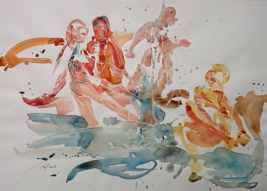 Das Leichte und Transparente der Aquarellmalerei kombiniert mit dem harten Kontrast der schwarzen Tusche hat für mich einen besonderen Reiz und sind meine bevorzugten Materialien auf Papier. Als weiteres Werkzeug in meinem Schaffensprozess habe ich den transparenten Maskierfilm für meine Techniken entdeckt. Als Abdeckmaterial für helle Passagen in der Aquarellmalerei konzipiert, verwende ich ihn als weiteren Überraschungsmoment indem ich auf weißem Papier transparente Linien ziehe und erst nach Auftrag der Aquarellfarbe das Ergebnis sehe.